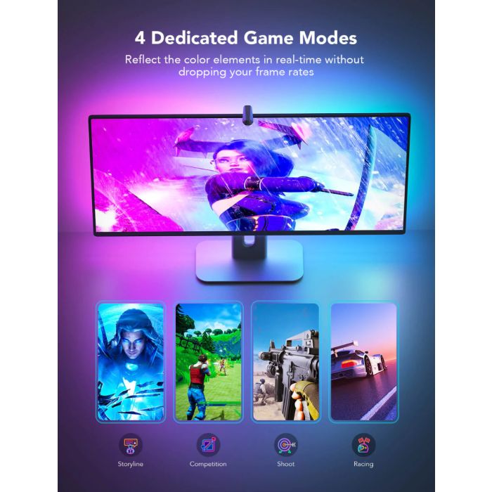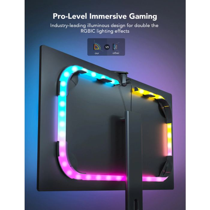 The Govee DreamView G1 Gaming Light brings immersive RGBIC ambient lighting to your gaming monitor setup. Designed for 24–32 inch screens, it uses screen sync to match colors in real-time for deeper gaming immersion. Ideal for PC gamers, streamers, and content creators looking to enhance visuals.